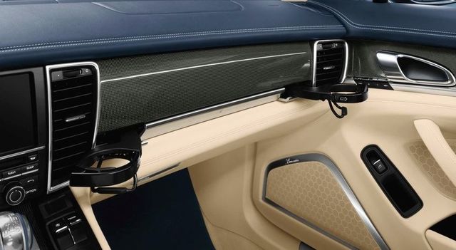 970 Panamera (2010-2016) 2 Fold-Out Cup Holders Above Glove Box. With variable diameter. Installed above the glove box behind the dashboard trim strip.