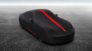 982 718 Boxster (2017+) Indoor Car Cover Plus. Black cover with piping, decorative strips and "PORSCHE" logo in red. Custom-fit indoor vehicle cover made from breathable, antistatic and dirt-repellent material. Hand-stitched with contrasting piping, decorative stripes, "PORSCHE" logo and colored Porsche Crest. The black material is 100% polyester and can be washed at 30° C.