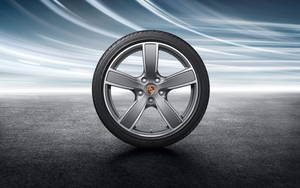 982 718 Boxster/Cayman (2017+) 20" Carrera Sport Summer Wheel/Tire Set. Complete set of 4 wheels with Pirelli P Zero tires mounted/balanced, and with TPM installed. One-piece alloy wheels in distinctive 5-spoke design. Painted in Platinum Silver with bright-polished areas. Front axle: 8.5 J x 20 RO 57 with 235/35 ZR 20 (88Y) tire- rear axle: 10.5 J x 20 RO 47 with 265/35 ZR 20 (95Y) tires.