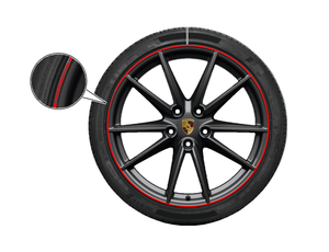 Genuine Porsche Rim Trim Strips Set - Set of 2. Set, consisting of two trim stickers for circumferential rim edge with "PORSCHE" logo in selected colors. Available for 20- and 21-inch wheels. *Select color and size from drop-down (part # will be changed internally per the color and size selected). *Fits most 911's, Boxsters, and Caymans from 2013+ with 20" and 21" wheels.